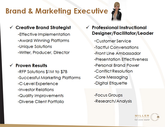 Ms. Miller works individually with CEOs and their teams from Fortune 500 companies to those with less than 50 employees. Most of her work involves all elements of Brand & Project Management, Strategic Marketing, Development, Corporate Culture, and Extreme Presentation Training. This includes creating, writing, editing, and packaging everything from marketing campaigns to RFP written responses and oral presentations. Her effective work includes the actual creation, strategic delivery, tonality, and construction of the marketing message platform.